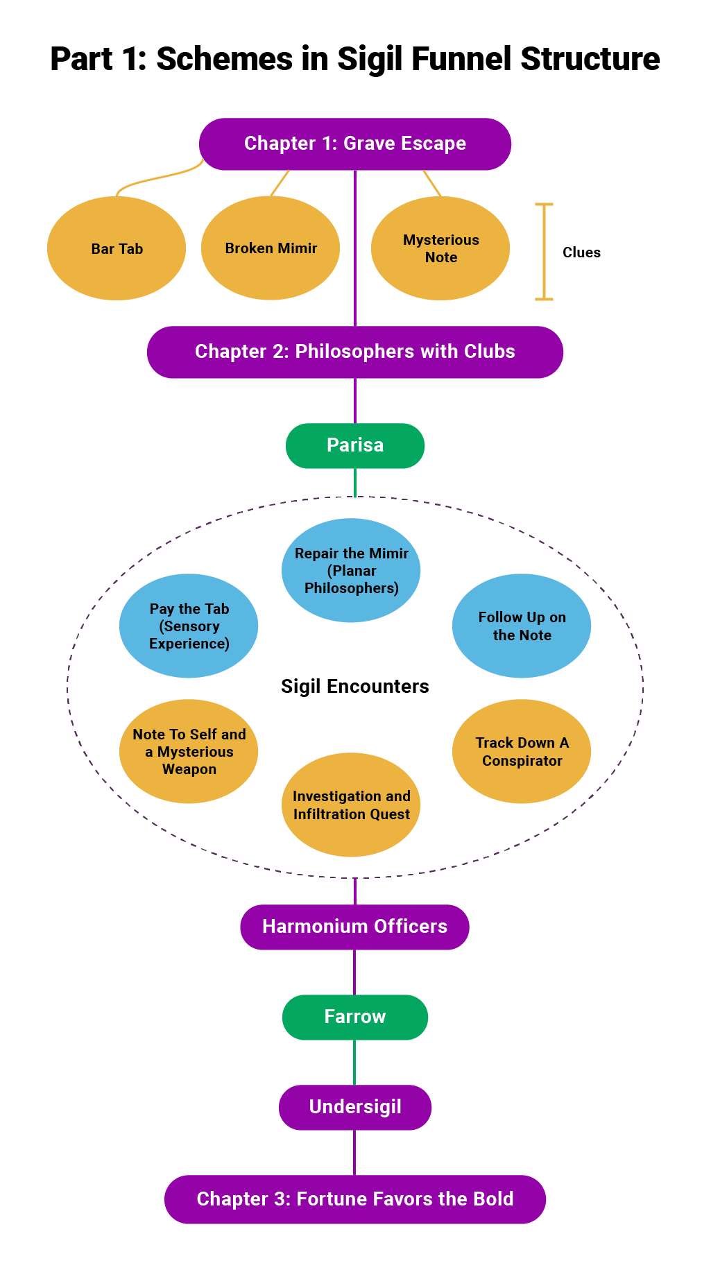 What we need is a good funnel with some clear clues to drive the players and give them a sense of momentum. That means we need to really beef up the Encounters in Sigil. I’m using pieces of the main adventure and some inspiration from Planescape lore to create a mystery that the characters will uncover that ties into the main plot. Here’s a glance at the new structure.